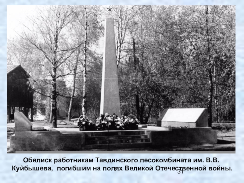 Слайд 31Обелиск работникам Тавдинского лесокомбината им. В.В.Куйбышева, погибшим на полях Великой Отечественной