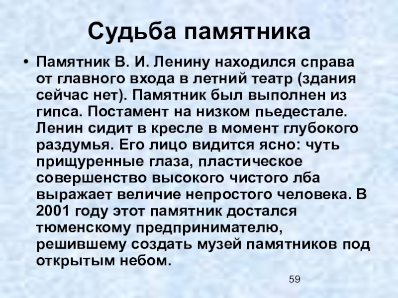 летний театр (здания сейчас нет). Памятник был выполнен из гипса. Постамент на низком пьедестале. Ленин сидит в кресле в момент глубокого раздумья. Его лицо видится ясно: чуть прищуренные глаза, пластическое совершенство высокого чистого лба выражает величие непростого человека. В 2001 году этот памятник достался тюменскому предпринимателю, решившему создать музей памятников под открытым небом.
