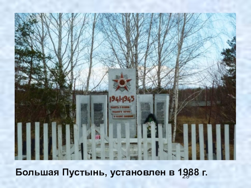 Слайд 29Большая Пустынь, установлен в 1988 г.