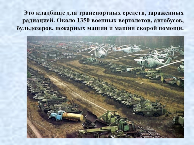 Слайд 97Это кладбище для транспортных средств, зараженных радиацией. Около 1350 военных вертолетов,