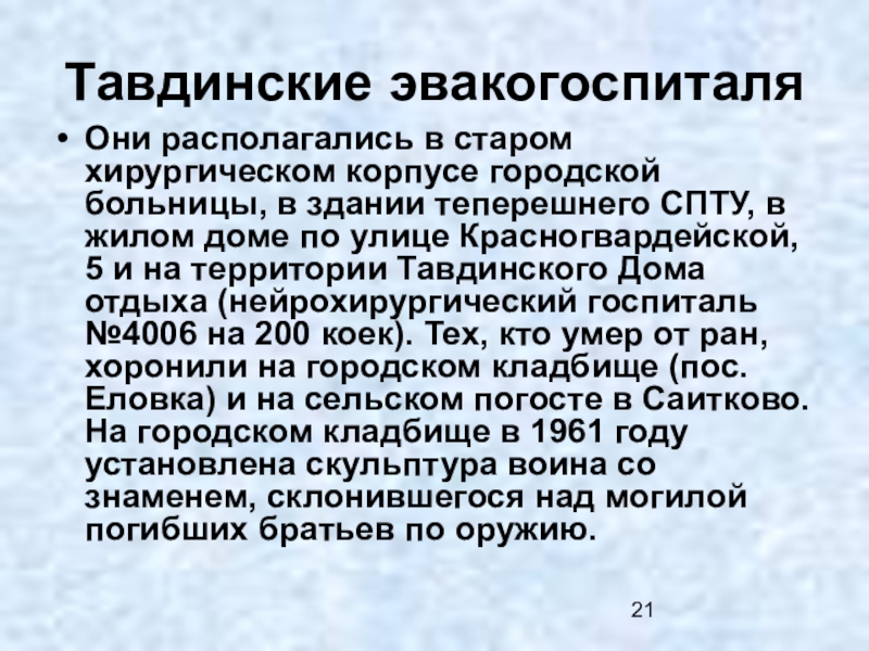 теперешнего СПТУ, в жилом доме по улице Красногвардейской, 5 и на территории Тавдинского Дома отдыха (нейрохирургический госпиталь №4006 на 200 коек). Тех, кто умер от ран, хоронили на городском кладбище (пос.Еловка) и на сельском погосте в Саитково. На городском кладбище в 1961 году установлена скульптура воина со знаменем, склонившегося над могилой погибших братьев по оружию.