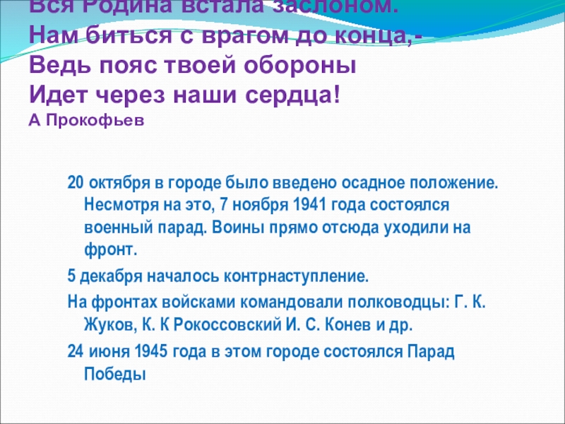 20 октября в городе было введено осадное положение. Несмотря на это, 7 ноября 1941 года состоялся военный парад. Воины прямо отсюда уходили на фронт.