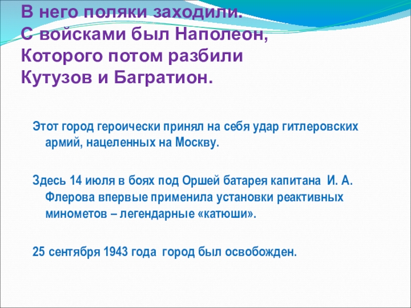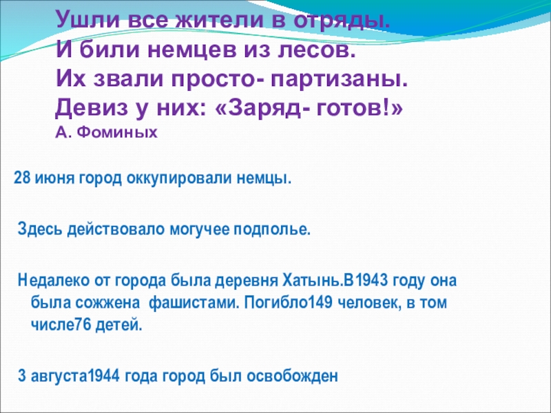 Недалеко от города была деревня Хатынь.В1943 году она была сожжена фашистами. Погибло149 человек, в том числе76 детей.