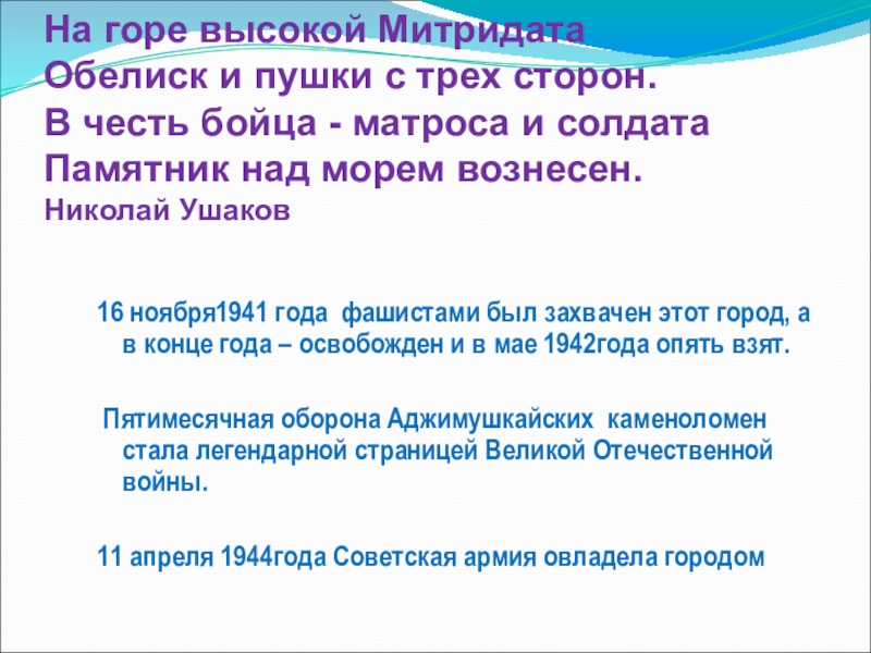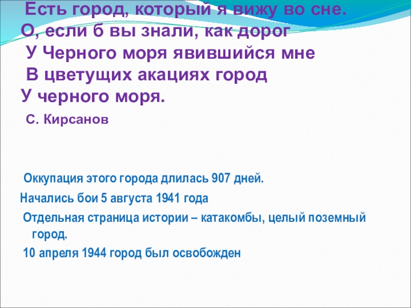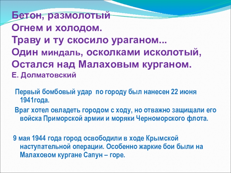 9 мая 1944 года город освободили в ходе Крымской наступательной операции. Особенно жаркие бои были на Малаховом кургане Сапун – горе.