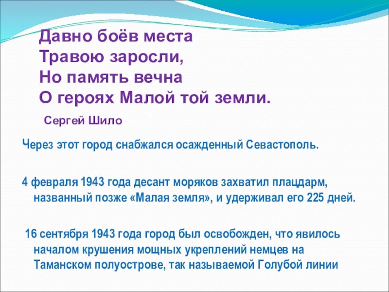 4 февраля 1943 года десант моряков захватил плацдарм, названный позже «Малая земля», и удерживал его 225 дней.