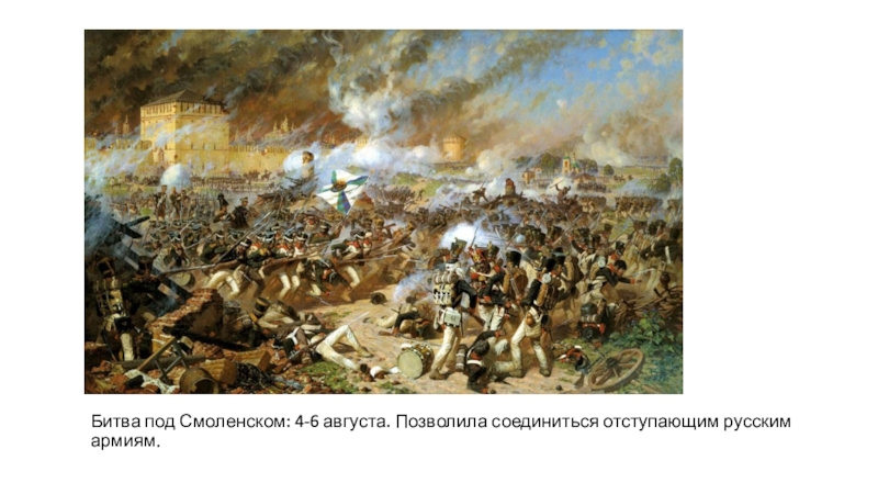 Слайд 8Битва под Смоленском: 4-6 августа. Позволила соединиться отступающим русским армиям.
