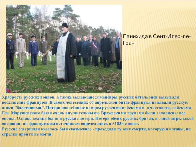 восхищение французов. В своих донесениях об апрельской битве французы называли русскую атаки "блестящими". Потери нанесённые немцам русскими войсками в, в частности, войсками Ген. Марушевского были очень внушительными. Вражескими трупами были заполнены все окопы. Однако велики были и русские потери. Потери обеих русских бригад, в одной апрельской операции, по французским источникам определялись в 5183 человек.