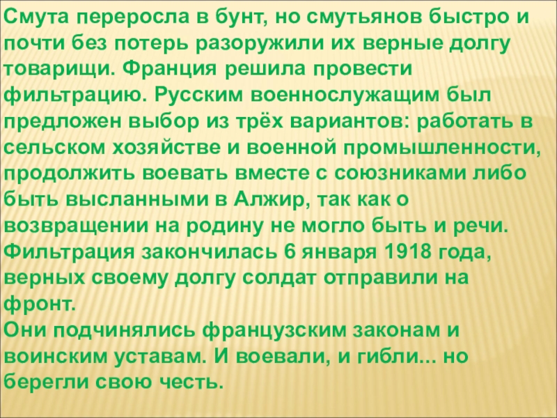 разоружили их верные долгу товарищи. Франция решила провести фильтрацию. Русским военнослужащим был предложен выбор из трёх вариантов: работать в сельском хозяйстве и военной промышленности, продолжить воевать вместе с союзниками либо быть высланными в Алжир, так как о возвращении на родину не могло быть и речи. Фильтрация закончилась 6 января 1918 года, верных своему долгу солдат отправили на фронт.