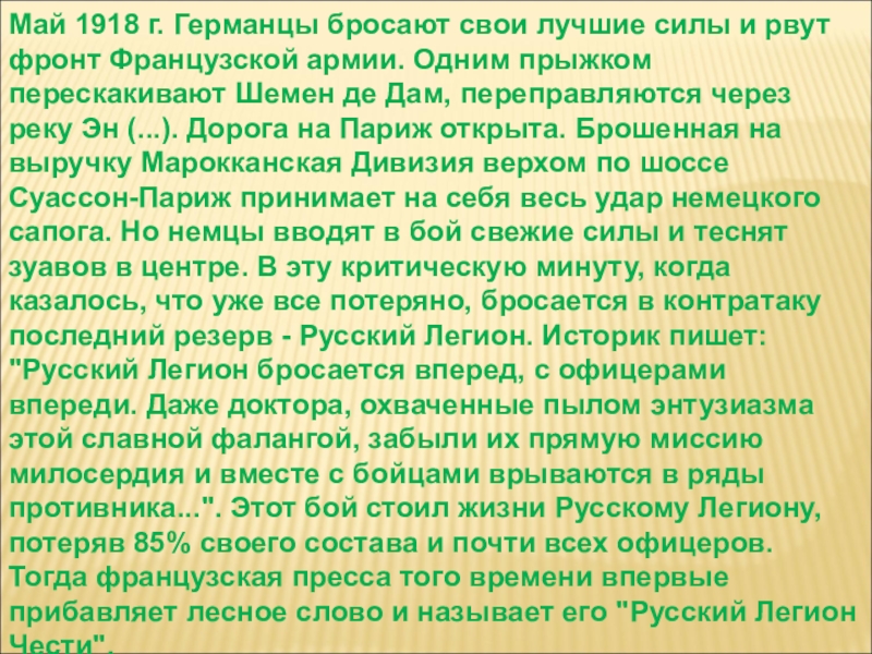 Французской армии. Одним прыжком перескакивают Шемен де Дам, переправляются через реку Эн (...). Дорога на Париж открыта. Брошенная на выручку Марокканская Дивизия верхом по шоссе Суассон-Париж принимает на себя весь удар немецкого сапога. Но немцы вводят в бой свежие силы и теснят зуавов в центре. В эту критическую минуту, когда казалось, что уже все потеряно, бросается в контратаку последний резерв - Русский Легион. Историк пишет: "Русский Легион бросается вперед, с офицерами впереди. Даже доктора, охваченные пылом энтузиазма этой славной фалангой, забыли их прямую миссию милосердия и вместе с бойцами врываются в ряды противника...". Этот бой стоил жизни Русскому Легиону, потеряв 85% своего состава и почти всех офицеров. Тогда французская пресса того времени впервые прибавляет лесное слово и называет его "Русский Легион Чести".
