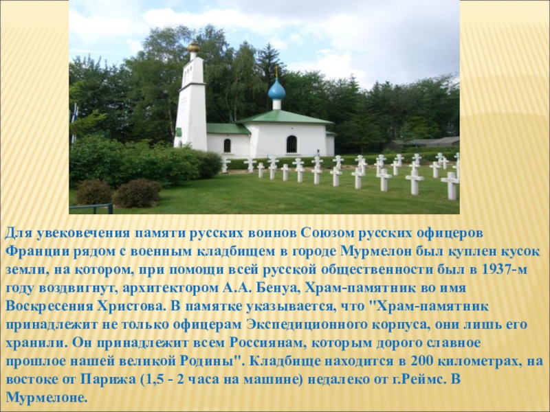 военным кладбищем в городе Мурмелон был куплен кусок земли, на котором, при помощи всей русской общественности был в 1937-м году воздвигнут, архитектором А.А. Бенуа, Храм-памятник во имя Воскресения Христова. В памятке указывается, что "Храм-памятник принадлежит не только офицерам Экспедиционного корпуса, они лишь его хранили. Он принадлежит всем Россиянам, которым дорого славное прошлое нашей великой Родины". Кладбище находится в 200 километрах, на востоке от Парижа (1,5 - 2 часа на машине) недалеко от г.Реймс. В Мурмелоне.