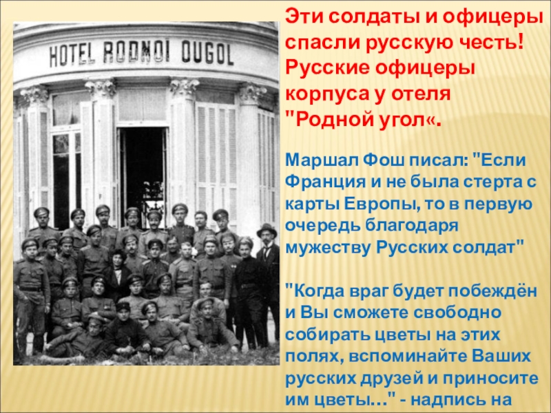 Маршал Фош писал: "Если Франция и не была стерта с карты Европы, то в первую очередь благодаря мужеству Русских солдат"