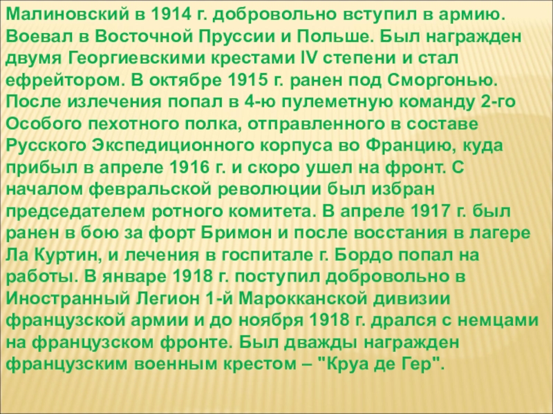 Слайд 12Малиновский в 1914 г. добровольно вступил в армию. Воевал в Восточной