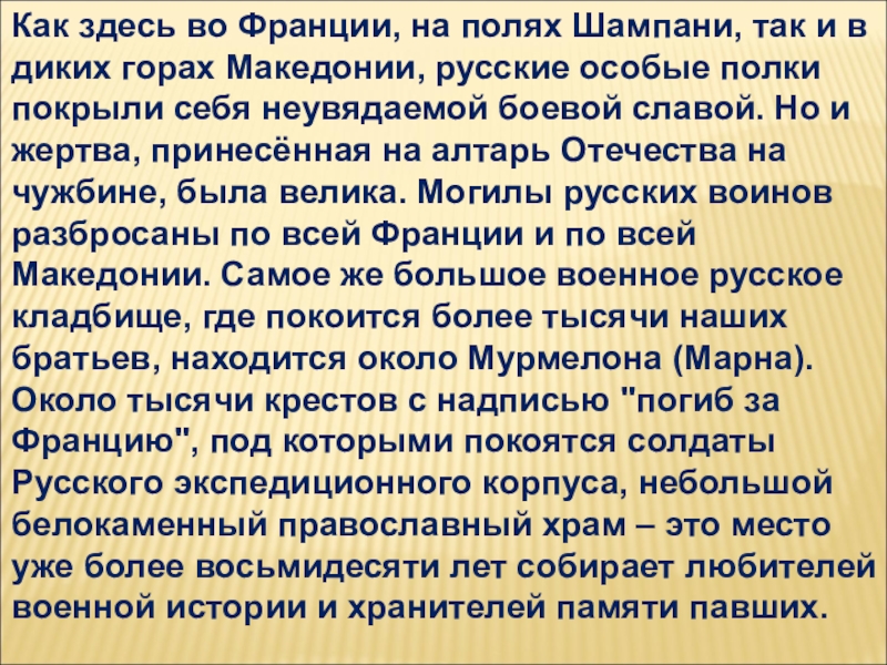 горах Македонии, русские особые полки покрыли себя неувядаемой боевой славой. Но и жертва, принесённая на алтарь Отечества на чужбине, была велика. Могилы русских воинов разбросаны по всей Франции и по всей Македонии. Самое же большое военное русское кладбище, где покоится более тысячи наших братьев, находится около Мурмелона (Марна).