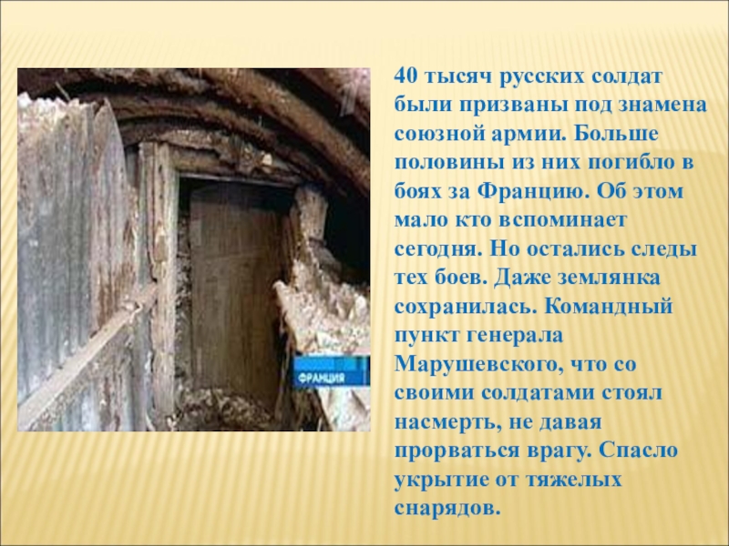 половины из них погибло в боях за Францию. Об этом мало кто вспоминает сегодня. Но остались следы тех боев. Даже землянка сохранилась. Командный пункт генерала Марушевского, что со своими солдатами стоял насмерть, не давая прорваться врагу. Спасло укрытие от тяжелых снарядов.