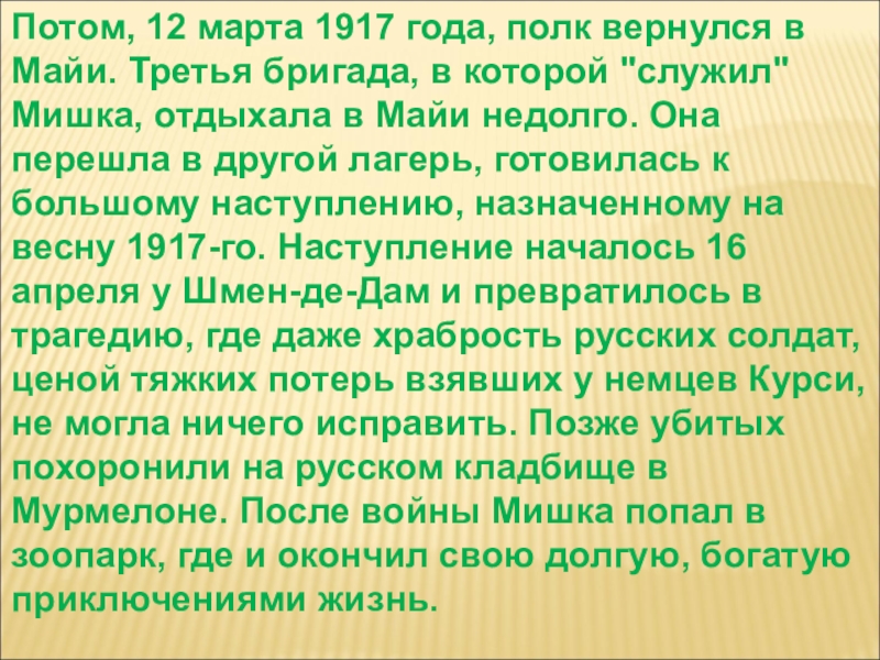 в которой "служил" Мишка, отдыхала в Майи недолго. Она перешла в другой лагерь, готовилась к большому наступлению, назначенному на весну 1917-го. Наступление началось 16 апреля у Шмен-де-Дам и превратилось в трагедию, где даже храбрость русских солдат, ценой тяжких потерь взявших у немцев Курси, не могла ничего исправить. Позже убитых похоронили на русском кладбище в Мурмелоне. После войны Мишка попал в зоопарк, где и окончил свою долгую, богатую приключениями жизнь.