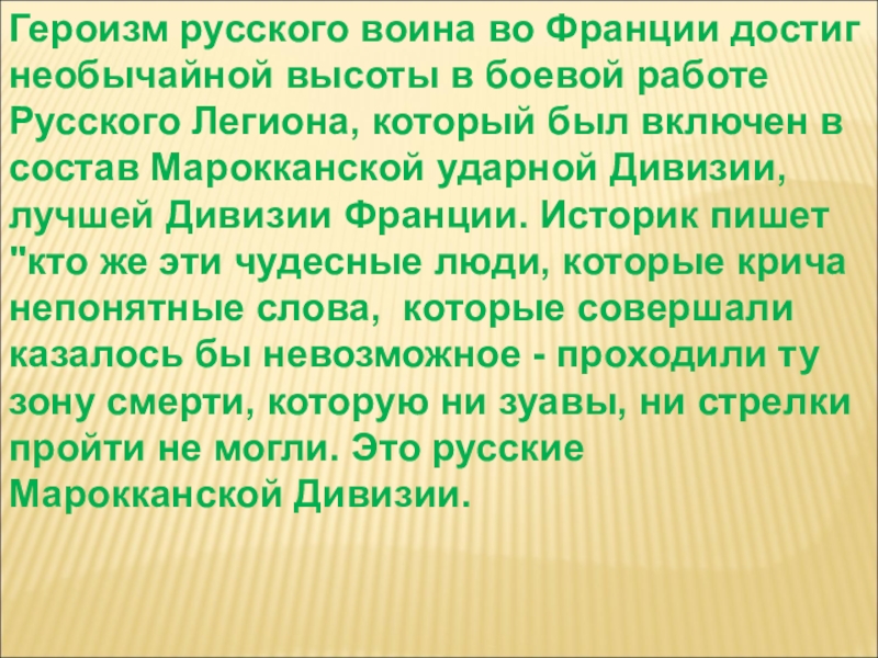 Русского Легиона, который был включен в состав Марокканской ударной Дивизии, лучшей Дивизии Франции. Историк пишет "кто же эти чудесные люди, которые крича непонятные слова, которые совершали казалось бы невозможное - проходили ту зону смерти, которую ни зуавы, ни стрелки пройти не могли. Это русские Марокканской Дивизии.