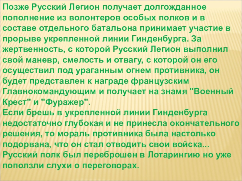 Если брешь в укрепленной линии Гинденбурга недостаточно глубокая и не принесла окончательного решения, то мораль противника была настолько подорвана, что он стал отводить свои войска... Русский полк был переброшен в Лотарингию но уже поползли слухи о переговорах.