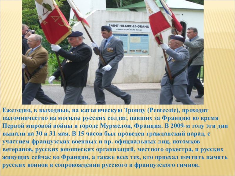 русских солдат, павших за Францию во время Первой мировой войны в городе Мурмелон, Франция. В 2009-м году эти дни выпали на 30 и 31 мая. В 15 часов был проведен гражданский парад, с участием французских военных и пр. официальных лиц, потомков ветеранов, русских юношеских организаций, местного оркестра, и русских живущих сейчас во Франции, а также всех тех, кто приехал почтить память русских воинов в сопровождении русского и французского гимнов.