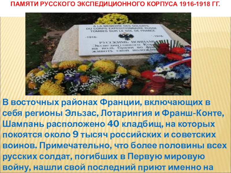 себя регионы Эльзас, Лотарингия и Франш-Конте, Шампань расположено 40 кладбищ, на которых покоятся около 9 тысяч российских и советских воинов. Примечательно, что более половины всех русских солдат, погибших в Первую мировую войну, нашли свой последний приют именно на востоке Франции.
