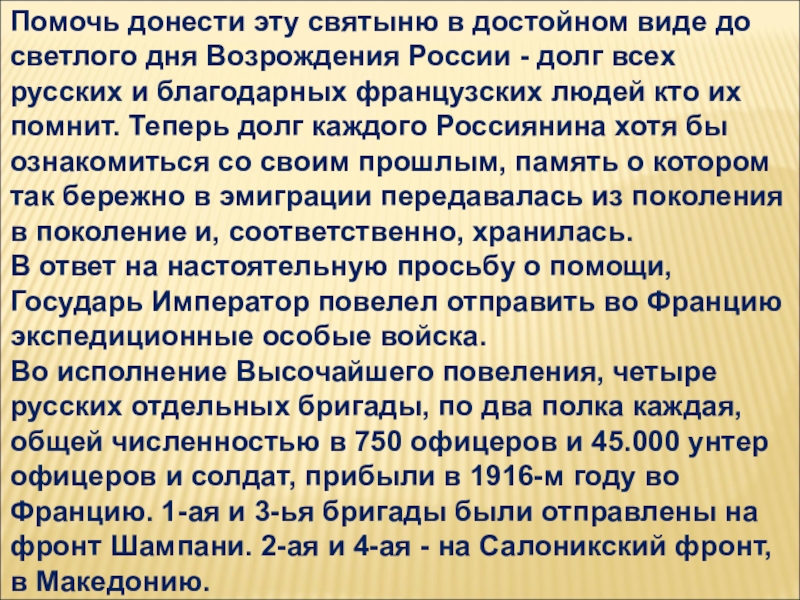 Во исполнение Высочайшего повеления, четыре русских отдельных бригады, по два полка каждая, общей численностью в 750 офицеров и 45.000 унтер офицеров и солдат, прибыли в 1916-м году во Францию. 1-ая и 3-ья бригады были отправлены на фронт Шампани. 2-ая и 4-ая - на Салоникский фронт, в Македонию.