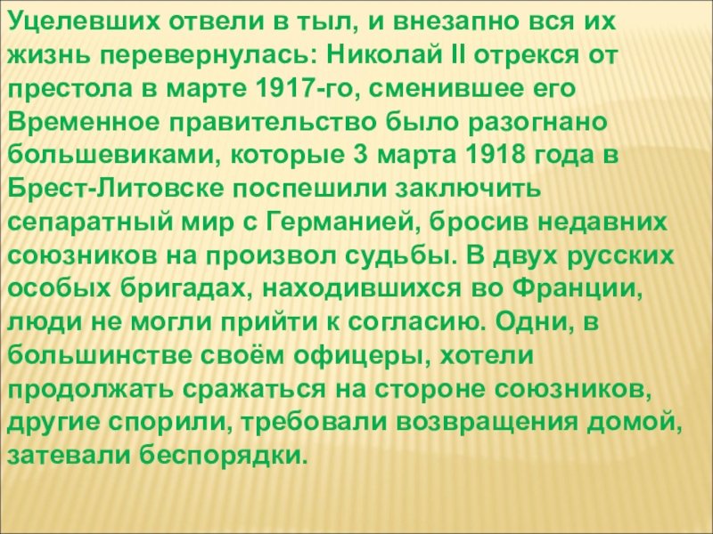 II отрекся от престола в марте 1917-го, сменившее его Временное правительство было разогнано большевиками, которые 3 марта 1918 года в Брест-Литовске поспешили заключить сепаратный мир с Германией, бросив недавних союзников на произвол судьбы. В двух русских особых бригадах, находившихся во Франции, люди не могли прийти к согласию. Одни, в большинстве своём офицеры, хотели продолжать сражаться на стороне союзников, другие спорили, требовали возвращения домой, затевали беспорядки.