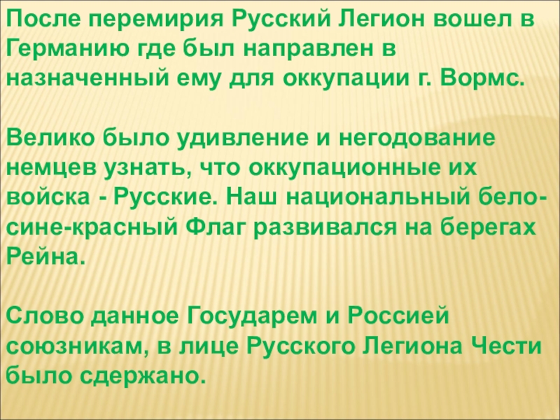 Слайд 24После перемирия Русский Легион вошел в Германию где был направлен в
