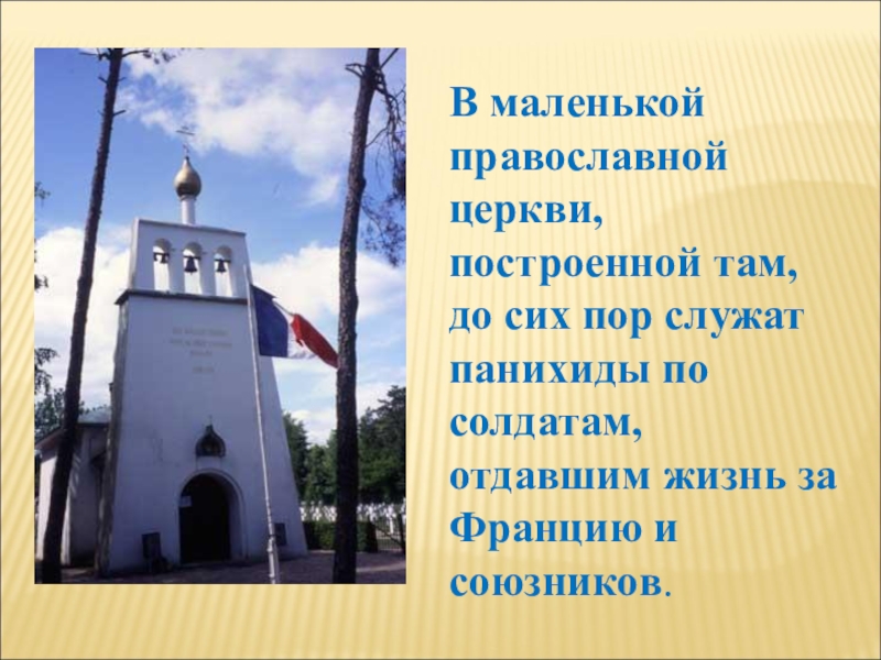 Слайд 30В маленькой православной церкви, построенной там, до сих пор служат панихиды