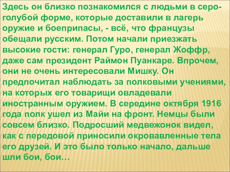 в лагерь оружие и боеприпасы, - всё, что французы обещали русским. Потом начали приезжать высокие гости: генерал Гуро, генерал Жоффр, даже сам президент Раймон Пуанкаре. Впрочем, они не очень интересовали Мишку. Он предпочитал наблюдать за полковыми учениями, на которых его товарищи овладевали иностранным оружием. В середине октября 1916 года полк ушел из Майи на фронт. Немцы были совсем близко. Подросший медвежонок видел, как с передовой приносили окровавленные тела его друзей. И это было только начало, дальше шли бои, бои…