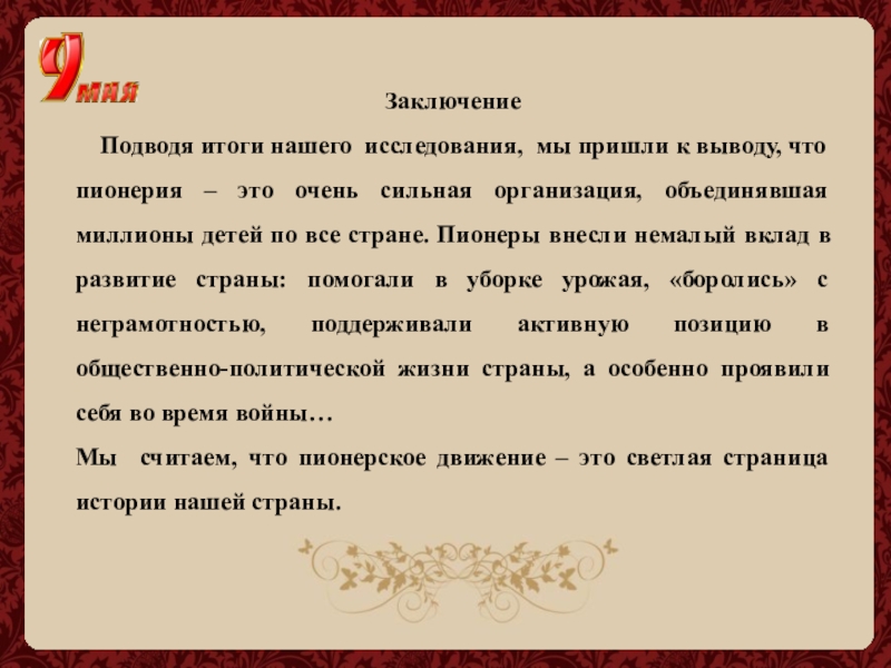 пионерия – это очень сильная организация, объединявшая миллионы детей по все стране. Пионеры внесли немалый вклад в развитие страны: помогали в уборке урожая, «боролись» с неграмотностью, поддерживали активную позицию в общественно-политической жизни страны, а особенно проявили себя во время войны…