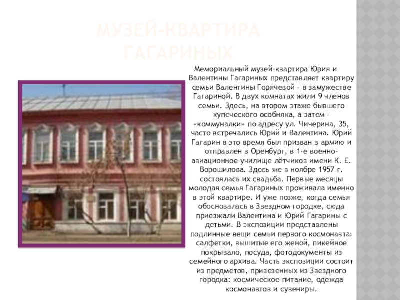 Горячевой – в замужестве Гагариной. В двух комнатах жили 9 членов семьи. Здесь, на втором этаже бывшего купеческого особняка, а затем – «коммуналки» по адресу ул. Чичерина, 35, часто встречались Юрий и Валентина. Юрий Гагарин в это время был призван в армию и отправлен в Оренбург, в 1-е военно-авиационное училище лётчиков имени К. Е. Ворошилова. Здесь же в ноябре 1957 г. состоялась их свадьба. Первые месяцы молодая семья Гагариных проживала именно в этой квартире. И уже позже, когда семья обосновалась в Звездном городке, сюда приезжали Валентина и Юрий Гагарины с детьми. В экспозиции представлены подлинные вещи семьи первого космонавта: салфетки, вышитые его женой, пикейное покрывало, посуда, фотодокументы из семейного архива. Часть экспозиции состоит из предметов, привезенных из Звездного городка: космическое питание, одежда космонавтов и сувениры.