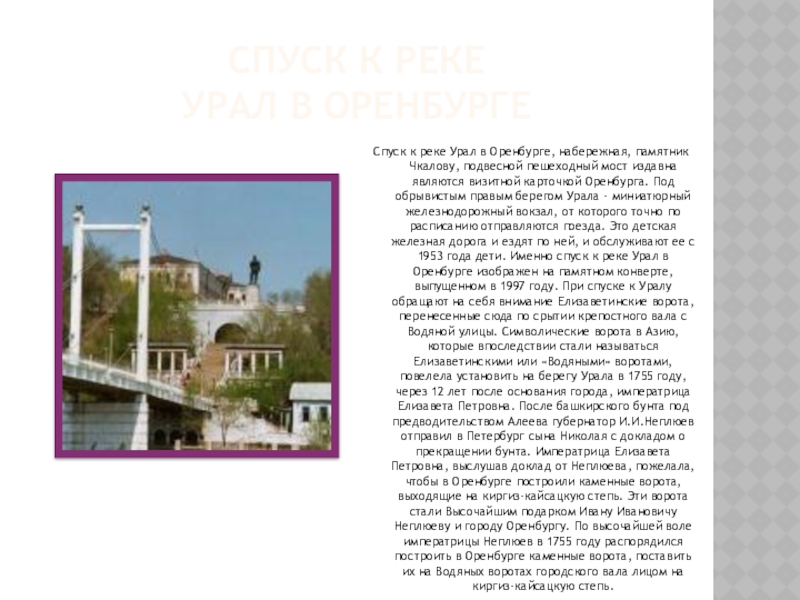 набережная, памятник Чкалову, подвесной пешеходный мост издавна являются визитной карточкой Оренбурга. Под обрывистым правым берегом Урала - миниатюрный железнодорожный вокзал, от которого точно по расписанию отправляются поезда. Это детская железная дорога и ездят по ней, и обслуживают ее с 1953 года дети. Именно спуск к реке Урал в Оренбурге изображен на памятном конверте, выпущенном в 1997 году. При спуске к Уралу обращают на себя внимание Елизаветинские ворота, перенесенные сюда по срытии крепостного вала с Водяной улицы. Cимволические ворота в Азию, которые впоследствии стали называться Елизаветинскими или «Водяными» воротами, повелела установить на берегу Урала в 1755 году, через 12 лет после основания города, императрица Елизавета Петровна. После башкирского бунта под предводительством Алеева губернатор И.И.Неплюев отправил в Петербург сына Николая с докладом о прекращении бунта. Императрица Елизавета Петровна, выслушав доклад от Неплюева, пожелала, чтобы в Оренбурге построили каменные ворота, выходящие на киргиз-кайсацкую степь. Эти ворота стали Высочайшим подарком Ивану Ивановичу Неплюеву и городу Оренбургу. По высочайшей воле императрицы Неплюев в 1755 году распорядился построить в Оренбурге каменные ворота, поставить их на Водяных воротах городского вала лицом на киргиз-кайсацкую степь.