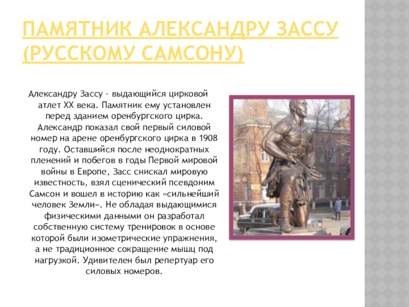века. Памятник ему установлен перед зданием оренбургского цирка. Александр показал свой первый силовой номер на арене оренбургского цирка в 1908 году. Оставшийся после неоднократных пленений и побегов в годы Первой мировой войны в Европе, Засс снискал мировую известность, взял сценический псевдоним Самсон и вошел в историю как «сильнейший человек Земли». Не обладая выдающимися физическими данными он разработал собственную систему тренировок в основе которой были изометрические упражнения, а не традиционное сокращение мышц под нагрузкой. Удивителен был репертуар его силовых номеров.