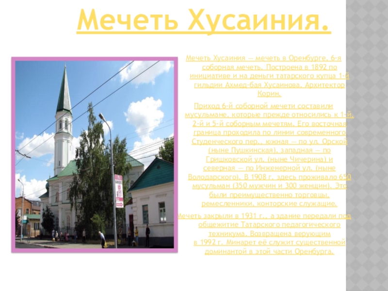 Слайд 13Мечеть Хусаиния — мечеть в Оренбурге, 6-я соборная мечеть. Построена в 1892 по инициативе и на