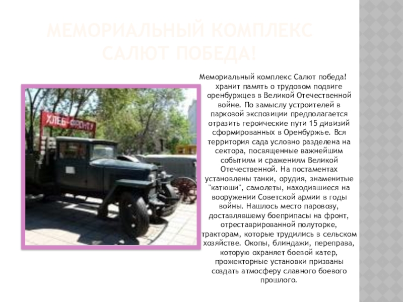 подвиге оренбуржцев в Великой Отечественной войне. По замыслу устроителей в парковой экспозиции предполагается отразить героические пути 15 дивизий сформированных в Оренбуржье. Вся территория сада условно разделена на сектора, посвященные важнейшим событиям и сражениям Великой Отечественной. На постаментах установлены танки, орудия, знаменитые "катюши", самолеты, находившиеся на вооружении Советской армии в годы войны. Нашлось место паровозу, доставлявшему боеприпасы на фронт, отреставрированной полуторке, тракторам, которые трудились в сельском хозяйстве. Окопы, блиндажи, переправа, которую охраняет боевой катер, прожекторные установки призваны создать атмосферу славного боевого прошлого.