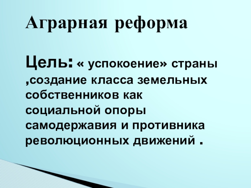 Цель: « успокоение» страны ,создание класса земельных собственников как