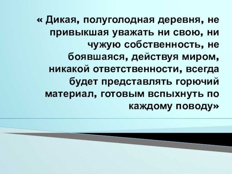 Слайд 5« Дикая, полуголодная деревня, не привыкшая уважать ни свою, ни чужую