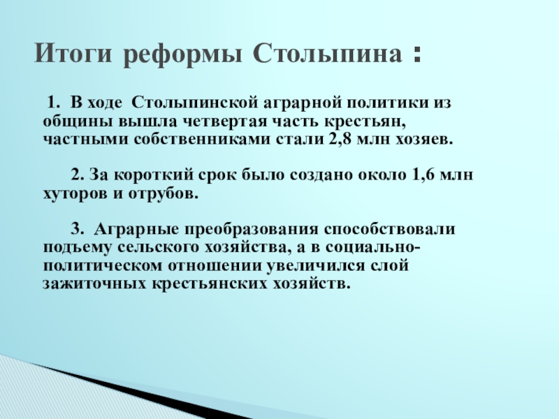3. Аграрные преобразования способствовали подъему сельского хозяйства, а в социально-политическом отношении увеличился слой зажиточных крестьянских хозяйств.