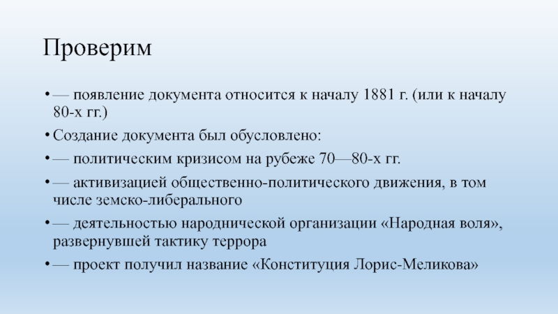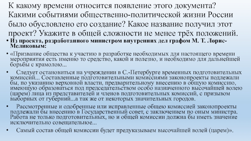 Из проекта, разработанного министром внутренних дел графом М. Т. Лорис-Меликовым: