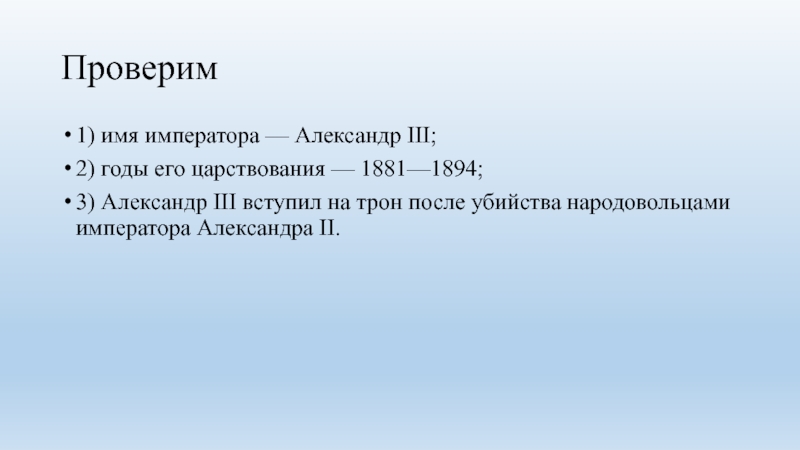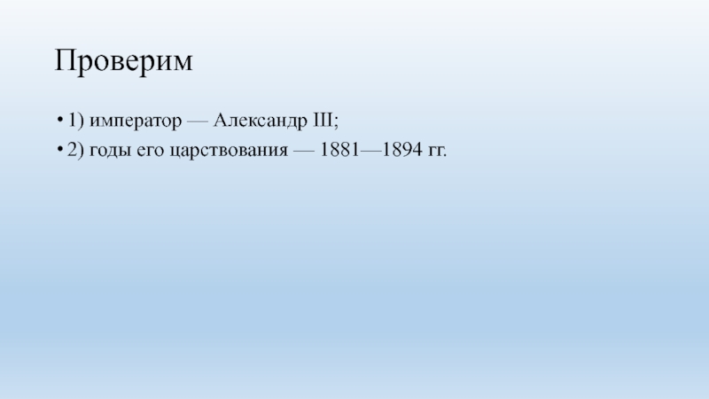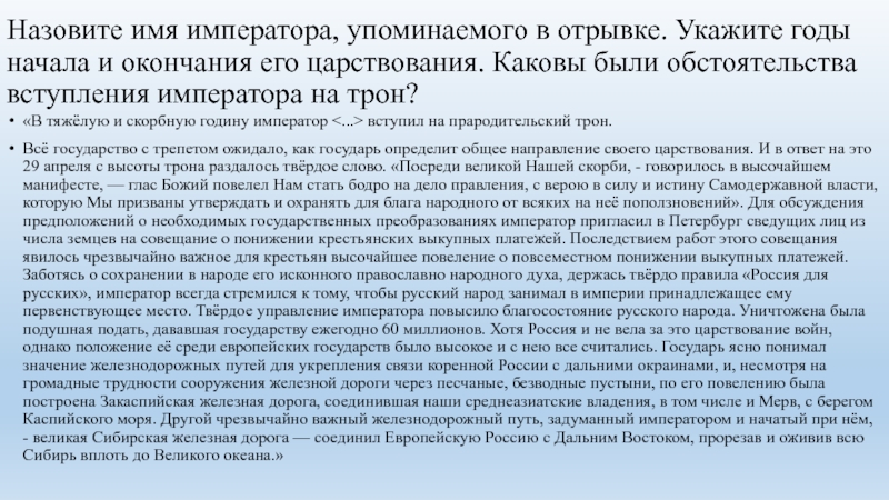 Всё государство с трепетом ожидало, как государь определит общее направление своего царствования. И в ответ на это 29 апреля с высоты трона раздалось твёрдое слово. «Посреди великой Нашей скорби, - говорилось в высочайшем манифесте, — глас Божий повелел Нам стать бодро на дело правления, с верою в силу и истину Самодержавной власти, которую Мы призваны утверждать и охранять для блага народного от всяких на неё поползновений». Для обсуждения предположений о необходимых государственных преобразованиях император пригласил в Петербург сведущих лиц из числа земцев на совещание о понижении крестьянских выкупных платежей. Последствием работ этого совещания явилось чрезвычайно важное для крестьян высочайшее повеление о повсеместном понижении выкупных платежей. Заботясь о сохранении в народе его исконного православно народного духа, держась твёрдо правила «Россия для русских», император всегда стремился к тому, чтобы русский народ занимал в империи принадлежащее ему первенствующее место. Твёрдое управление императора повысило благосостояние русского народа. Уничтожена была подушная подать, дававшая государству ежегодно 60 миллионов. Хотя Россия и не вела за это царствование войн, однако положение её среди европейских государств было высокое и с нею все считались. Государь ясно понимал значение железнодорожных путей для укрепления связи коренной России с дальними окраинами, и, несмотря на громадные трудности сооружения железной дороги через песчаные, безводные пустыни, по его повелению была построена Закаспийская железная дорога, соединившая наши среднеазиатские владения, в том числе и Мерв, с берегом Каспийского моря. Другой чрезвычайно важный железнодорожный путь, задуманный императором и начатый при нём, - великая Сибирская железная дорога — соединил Европейскую Россию с Дальним Востоком, прорезав и оживив всю Сибирь вплоть до Великого океана.»