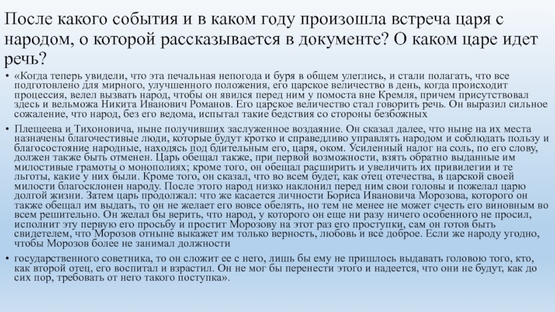 «Когда теперь увидели, что эта печальная непогода и буря в общем улеглись, и стали полагать, что все подготовлено для мирного, улучшенного положения, его царское величество в день, когда происходит процессия, велел вызвать народ, чтобы он явился перед ним у помоста вне Кремля, причем присутствовал здесь и вельможа Никита Иванович Романов. Его царское величество стал говорить речь. Он выразил сильное сожаление, что народ, без его ведома, испытал такие бедствия со стороны безбожных