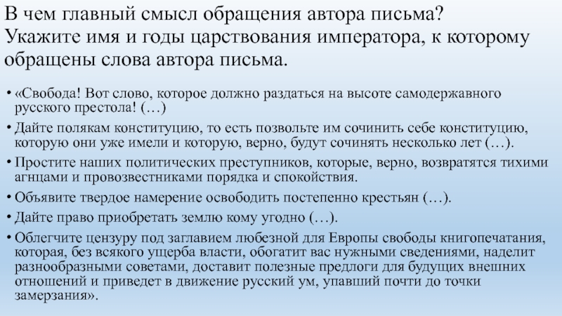 «Свобода! Вот слово, которое должно раздаться на высоте самодержавного русского престола! (…)