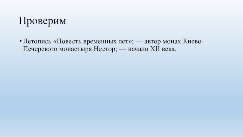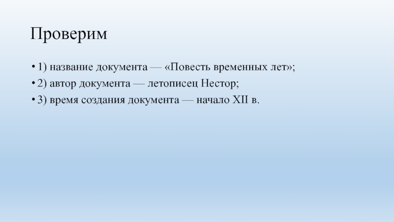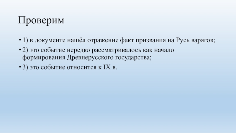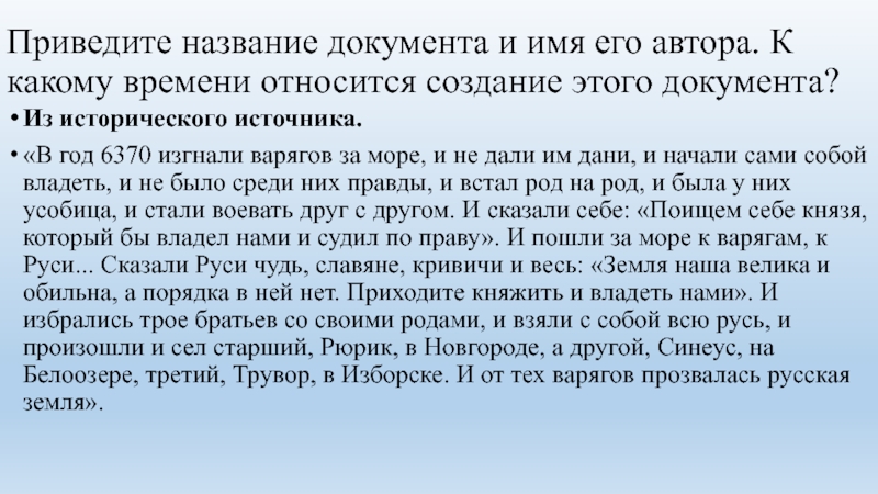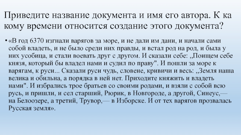 «В год 6370 изгнали варягов за море, и не дали им дани, и начали сами собой владеть, и не было среди них правды, и встал род на род, и была у них усобица, и стали воевать друг с другом. И сказали себе: «Поищем себе князя, который бы владел нами и судил по праву». И пошли за море к варягам, к Руси... Сказали Руси чудь, славяне, кривичи и весь: «Земля наша велика и обильна, а порядка в ней нет. Приходите княжить и владеть нами». И избрались трое братьев со своими родами, и взяли с собой всю русь, и произошли и сел старший, Рюрик, в Новгороде, а другой, Синеус, на Белоозере, третий, Трувор, в Изборске. И от тех варягов прозвалась русская земля».