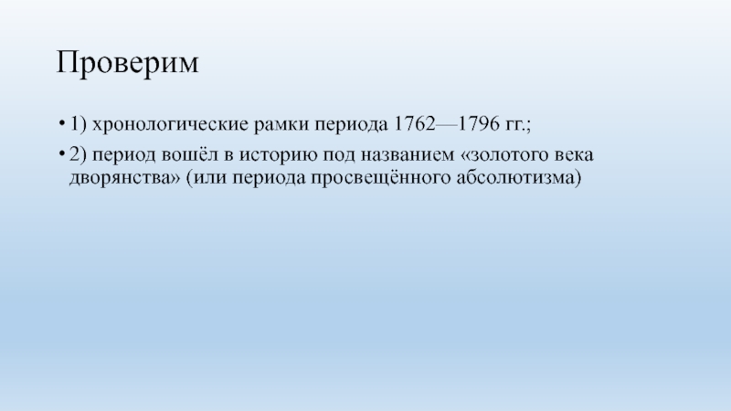 Перед ней были реальные цели укрепления самодержавия, проведения необходимых военной, административной и сословной реформ. Она осуществляла их в едином ключе, с одной генеральной идеей — максимально способствовать развитию и совершенствованию того "регулярного" государства, основы которого заложил ещё Пётр Великий.
