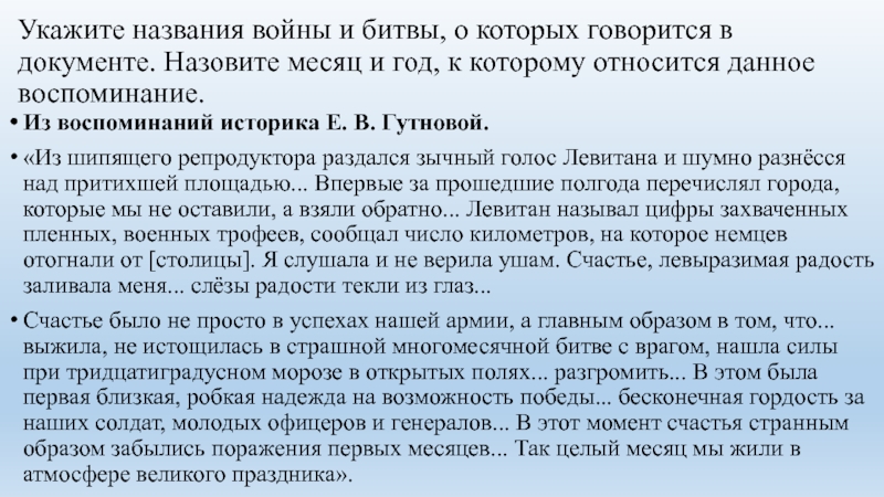 «Из шипящего репродуктора раздался зычный голос Левитана и шумно разнёсся над притихшей площадью... Впервые за прошедшие полгода перечислял города, которые мы не оставили, а взяли обратно... Левитан называл цифры захваченных пленных, военных трофеев, сообщал число километров, на которое немцев отогнали от [столицы]. Я слушала и не верила ушам. Счастье, левыразимая радость заливала меня... слёзы радости текли из глаз...