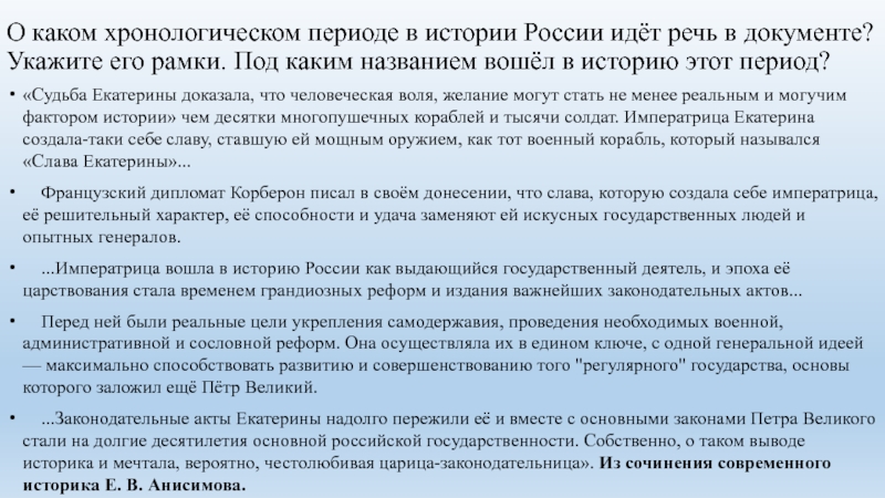 ...Законодательные акты Екатерины надолго пережили её и вместе с основными законами Петра Великого стали на долгие десятилетия основной российской государственности. Собственно, о таком выводе историка и мечтала, вероятно, честолюбивая царица-законодательница». Из сочинения современного историка Е. В. Анисимова.
