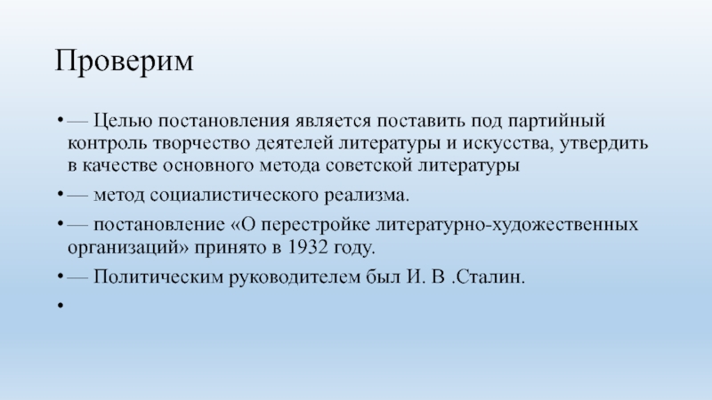 «ЦК констатирует, что за последние годы на основе значительных успехов социалистического строительства достигнут большой как количественный, так и качественный рост литературы и искусства. Несколько лет тому назад, когда в литературе налицо было еще значительное влияние чуждых элементов, особенно оживившихся в первые годы нэпа, а кадры пролетарской литературы были еще слабы, партия всемерно помогала созданию и укреплению особых пролетарских организаций в области литературы и ...искусства в целях укрепления позиций пролетарских писателей и работников искусства.