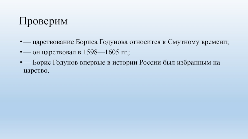 Он не был, но бывал тираном; не безумствовал, но злодействовал, подобно Иоанну, устраняя совместников или казня недоброжелателей. Если Годунов на время благоустроил державу, на время возвысил ее во мнении Европы, то не он ли ввергнул Россию в бездну злополучия почти неслыханного – предал в добычу ляхам и бродягам, назвал сонм мстителей и самозванцев истреблением древнего племени царского? Не он ли наконец, более содействовал уничтожению престола, воссев на нем святоубийцею?»