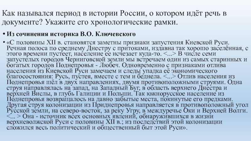 «С половины XII в. становятся заметны признаки запустения Киевской Руси. Речная полоса по среднему Днестру с притоками, издавна так хорошо заселённая, с этого времени пустеет, население ее исчезает куда-то. <...> В числе семи запустелых городов Черниговской земли мы встречаем один из самых старинных и богатых городов Поднепровья - Любеч. Одновременно с признаками отлива населения из Киевской Руси замечаем и следы упадка её экономического благосостояния: Русь, пустея, вместе с тем и беднела. <...> Отлив населения из Поднепровья шёл в двух направлениях, двумя противоположными струями. Одна струя направлялась на запад, на Западный Буг, в область верхнего Днестра и верхней Вислы, в глубь Галиции и Польши. Так южнорусское население из Поднепровья возвращалось на давно забытые места, покинутые его предками. Другая струя колонизации из Приднепровья направляется в противоположный угол Русской земли, на северо-восток, за реку Угру, в междуречье Оки и Верхней Волги. <... > Она - источник всех основных явлений, обнаружившихся в жизни верхневолжской Руси с половины XII в.; из последствий этой колонизации сложился весь политический и общественный быт этой Руси».