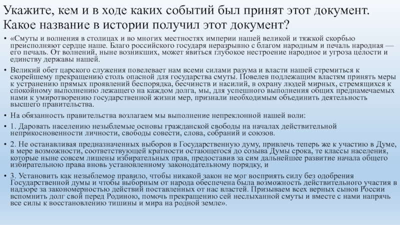 «Смуты и волнения в столицах и во многих местностях империи нашей великой и тяжкой скорбью преисполняют сердце наше. Благо российского государя неразрывно с благом народным и печаль народная — его печаль. От волнений, ныне возникших, может явиться глубокое нестроение народное и угроза целости и единству державы нашей.
