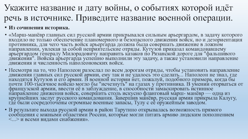 В результате выхода русской армии в район Тарутино открывалась возможность прямого сообщения с южными областями России, которые могли питать армию людским пополнением <...> и всеми видами снабжения».
